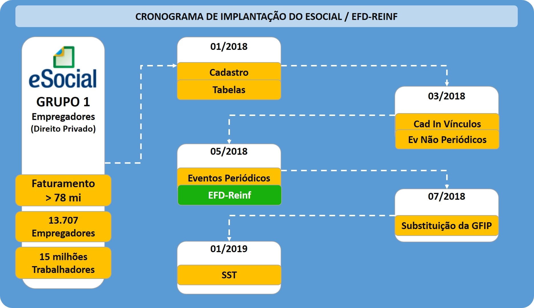 Não há novidade mas a medida traz para o contexto legal o reconhecimento da fase de implantação e também do eSocial e EFD-Reinf como novas obrigações acessórias e/ou principais, inclusive fortalecendo o cronograma já disponível e apresentado pelo fisco recentemente.