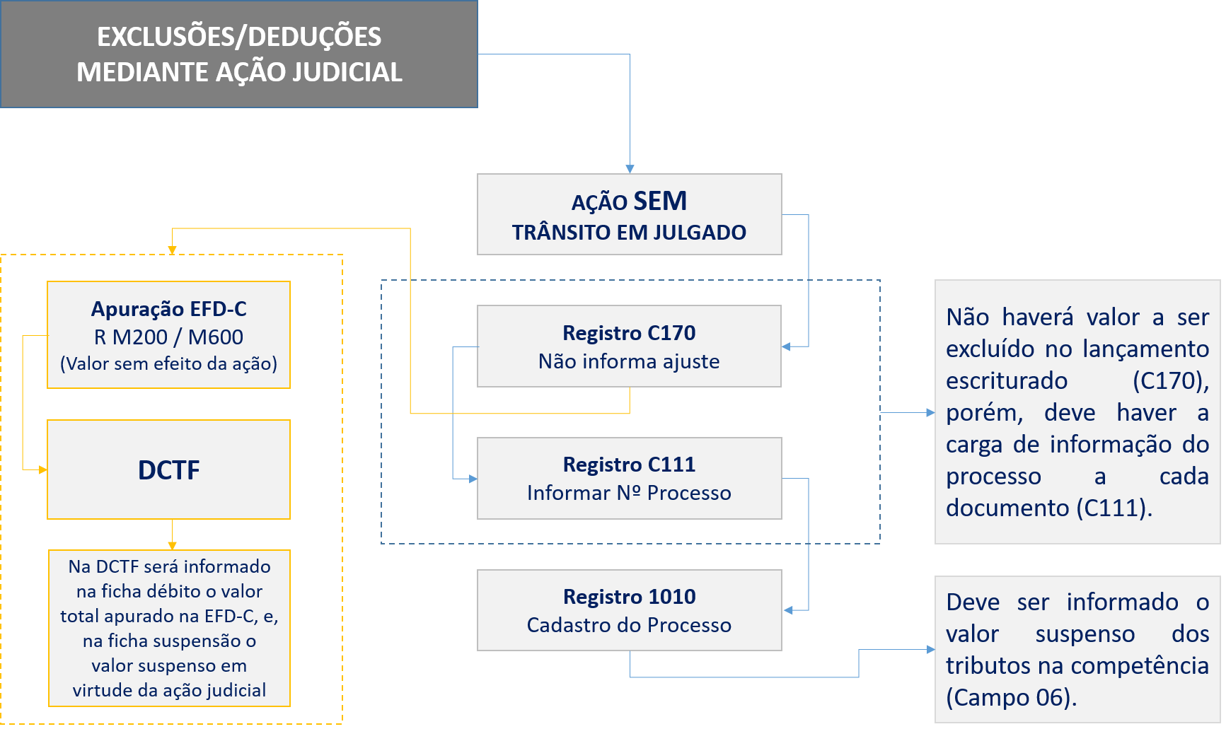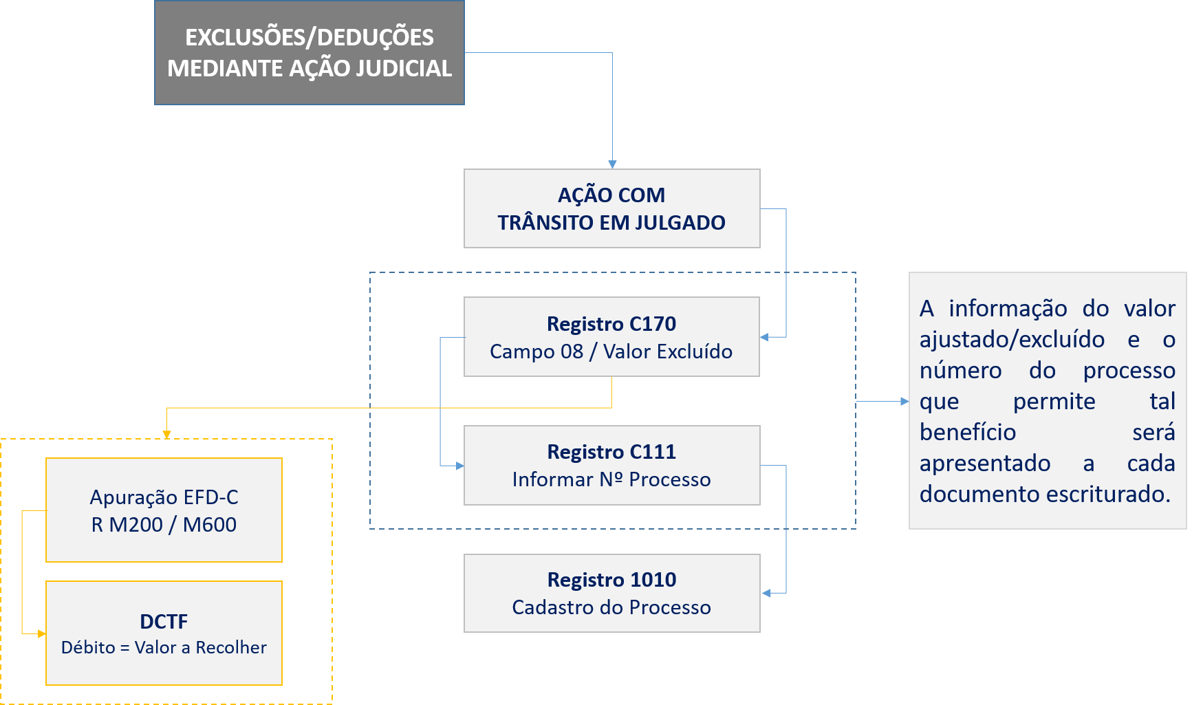 Considerando o exposto, o contribuinte deverá realizar a priori a escrituração dos documentos fiscais sem os respectivos efeitos da ação judicial, devendo para tal dar esse respeito na formalização da EFD-Contribuições, ou seja, a EFD-Contribuições contemplará uma apuração normal sem os efeitos da ação judicial, devendo, no entanto, ser levado aos competentes registros apenas as informações de existência da medida judicial temporal (Registros C111 e 1010).