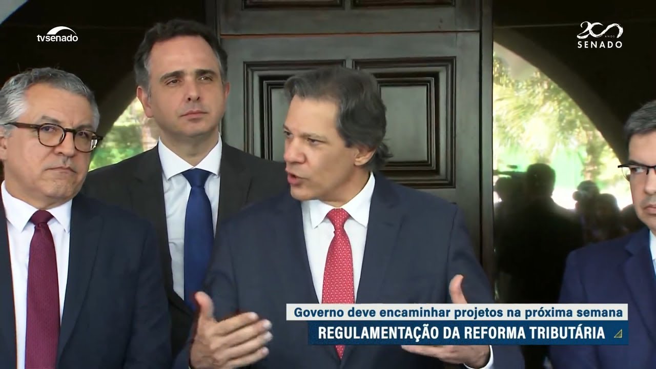 O governo federal prometeu enviar na semana que vem ao Congresso Nacional os projetos de lei complementar para regulamentar a reforma tributária. O anúncio foi feito pelo ministro da Fazenda, Fernando Haddad, na segunda (8), em reunião na residência oficial do Senado com o presidente da Casa, Rodrigo Pacheco, e líderes do governo. O ministro das Relações Institucionais, Alexandre Padilha, também participou do encontro. Está em estudo o envio de dois projetos de lei.
