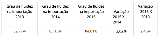 No ano de 2015, 84,81% dos despachos de importação foram liberados pela Receita Federal em menos de um dia. Isto representa uma melhora da fluidez na importação de 2,02% em relação ao ano de 2014 e de 2,22% em relação ao ano de 2013. Na importação, a fluidez é medida pelo percentual de declarações que são desembaraçadas com menos de 24 horas (Indicador do Grau de Fluidez). De acordo com o Coordenador-Geral de Administração Aduaneira, José Carlos de Araújo, os números não somente demonstram os bons resultados, mas a constante preocupação da Instituição com a agilidade nas operações de importação.
