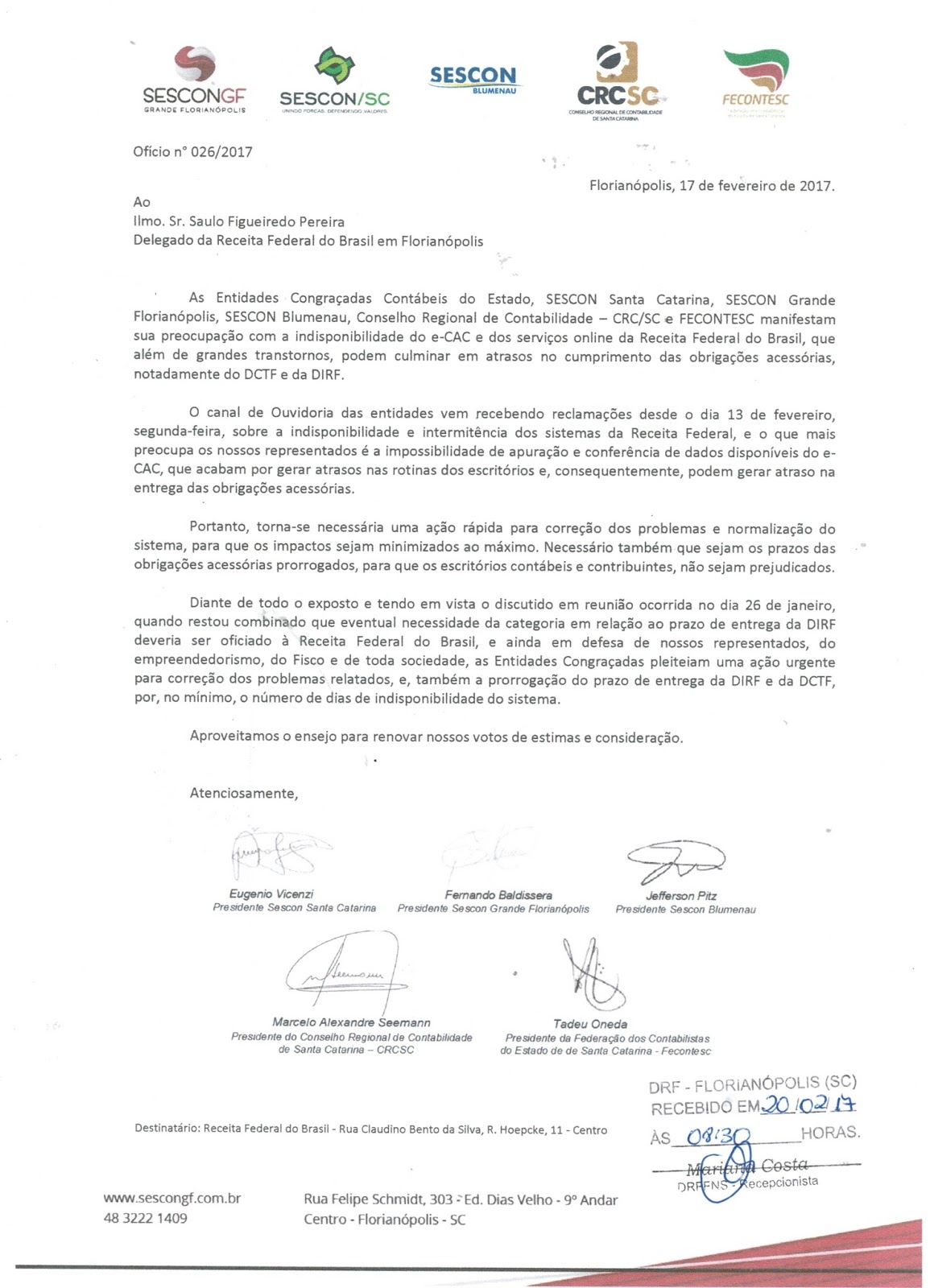 As entidades de Santa Catarina, protocolaram um ofício junto a Receita Federal do Brasil para que a mesma possa tomar providências quanto as instabilidades do sistema e-CAC e demais serviços online. Essas instabilidades estão ocasionando possíveis atrasos nas entregas de algumas obrigações como a DIRF e DCTF.
