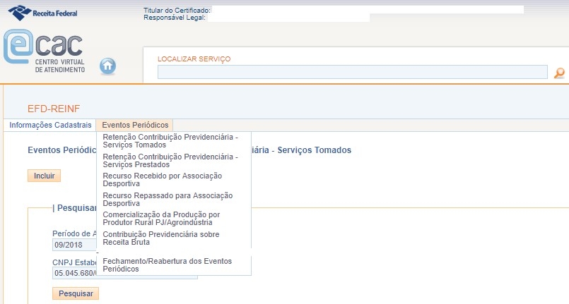 Caros amigos, conforme previsto e havíamos falado no nosso último eCONAgro a Receita Federal do Brasil disponibilizou o novo ambiente de EFD-Reinf, agora com acesso em núvem via eCAC. Veja a imagem abaixo: