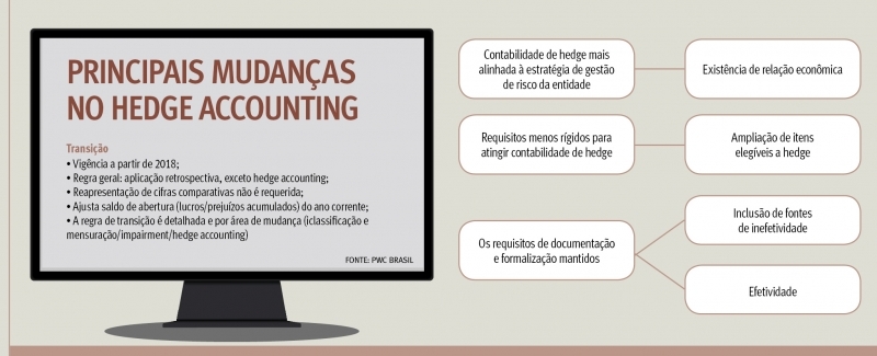 Outra mudança crucial relacionada à norma contábil IFRS 9 diz respeito à contabilização de hedge. Embora as empresas possam notar algumas mudanças na classificação, mensuração e impairment (regra segunda a qual a companhia deverá efetuar, periodicamente, análise sobre a recuperação dos valores registrados no imobilizado e no intangível), as mudanças em hedge accounting são as que provavelmente terão o maior impacto, pelo menos para as entidades que fazem ou pretendem fazer uso dessa alternativa contábil.
