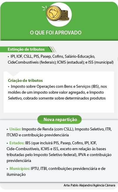 A proposta aprovada extingue oito tributos federais (IPI, IOF, CSLL, PIS, Pasep, Cofins, Salário-Educação e Cide-Combustíveis), o ICMS (estadual) e o ISS (municipal). No lugar deles, serão criados um imposto sobre o valor agregado de competência estadual, chamado de Imposto sobre Operações com Bens e Serviços (IBS), e um imposto sobre bens e serviços específicos (Imposto Seletivo), de competência federal.