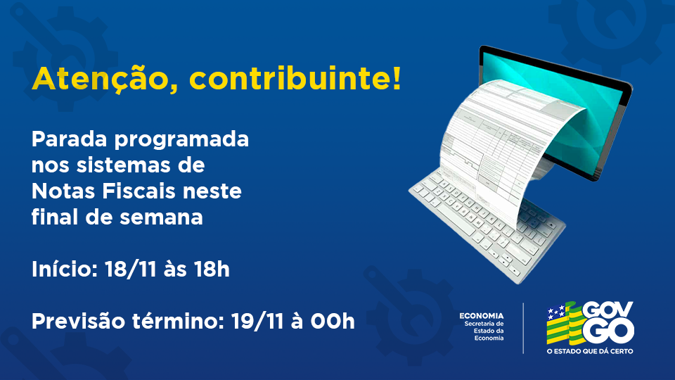 A Coordenação de Documentos Fiscais da Secretaria da Economia comunica aos contribuintes que será realizada manutenção programada dos sistemas da Secretaria da Economia das 18 horas deste sábado (18/11) até a meia-noite de domingo (19/11).