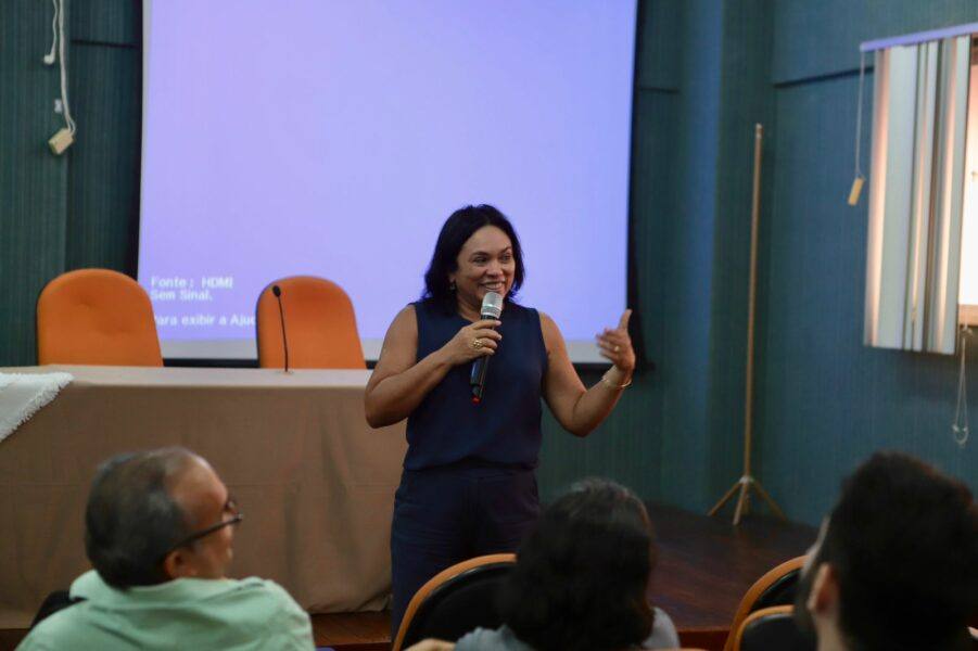 A auditora fiscal Gardênia Braga conduziu uma palestra sobre reforma tributária, na manhã desta quinta-feira (14), no auditório da Escola Fazendária. O secretário da Fazenda, Emílio Júnior, esteve presente e demais auditores da Receita Estadual.