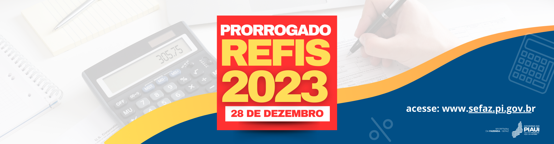 O governo do Estado, por meio da Secretaria Estadual da Fazenda do Piauí (Sefaz-PI), prorrogou o prazo para pagamento dos tributos estaduais (ICMS, IPVA, ITCMD) por meio do Programa de Recuperação de Créditos Tributários, denominado REFIS 2023. Agora, o último prazo para pagamento é o próximo dia 28 de dezembro, último dia de expediente bancário normal do ano.