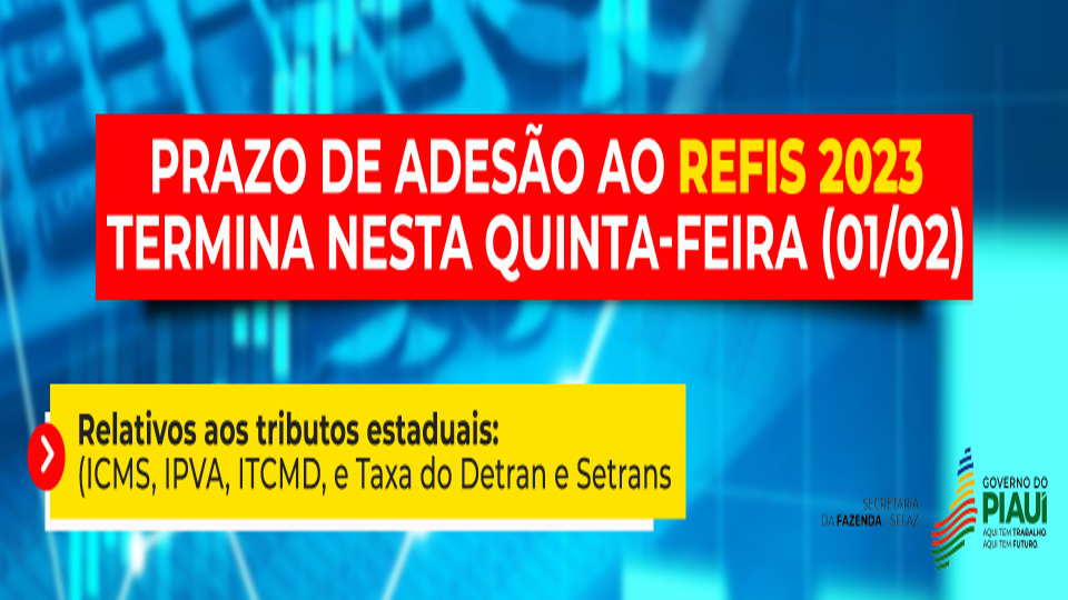 O Governo do Estado, por meio da Secretaria Estadual da Fazenda do Piauí (Sefaz-PI), alerta aos contribuintes que termina nesta quinta-feira (01-02) o prazo para quitarem débitos relativos aos tributos estaduais (ICMS, IPVA, ITCMD, e Taxa do Detran e Setrans), por meio do Programa de Recuperação de Créditos Tributários, denominado Refis 2023.