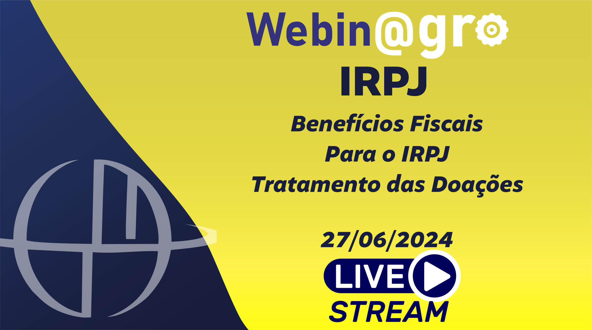 Em virtude disso, o nosso próximo Webinagro, dia 27 de junho de 2024, as 10h (Fuso de Brasília), vamos explorar estes benefícios fiscais para o IRPJ nas doações. Não perca esta oportunidade de entender como sua empresa pode se beneficiar fiscalmente enquanto faz a diferença na sociedade.