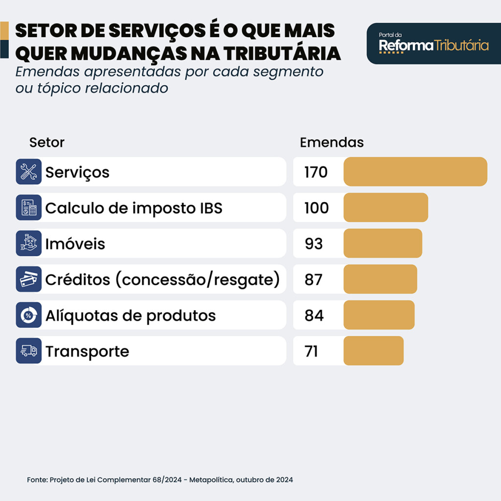 Levantamento da consultoria Metapolítica, feito a pedido do Portal da Reforma Tributária, mostra que o setor de serviços é o que lidera no número de sugestões para fazer alterações na proposta. Foram 170 emendas. O segmento inclui prestadores de serviços comerciais, profissionais liberais, setores culturais, entre outros.