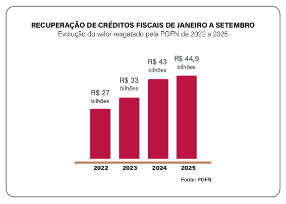 A Procuradoria-Geral da Fazenda Nacional (PGFN) recuperou, de janeiro a setembro deste ano, R$ 44,9 bilhões em créditos inscritos na dívida ativa da União. O valor é 4,4% superior ao que foi devolvido aos cofres públicos no mesmo período de 2024.