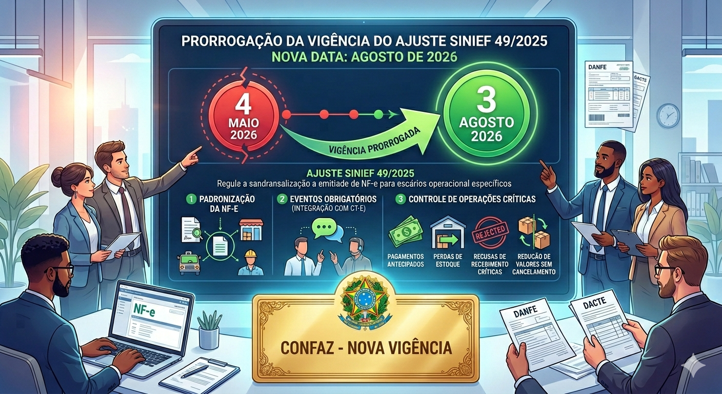 Inicialmente previsto para entrar em vigor em 04/05/2026, o referido ajuste passa agora a produzir efeitos a partir de agosto de 2026, conforme alteração promovida pelo Ajuste SINIEF nº 15, de 2026.